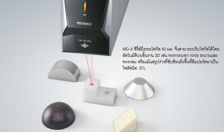 เทคโนโลยี 3-Axis ของ KEYENCE เป็นเทคโนโลยีแรกในวงการที่สามารถทำการปรับโฟกัสได้ในขณะทำการมาร์ก ด้วยโฟกัสอัตโนมัติ เลเซอร์มาร์กเกอร์ชนิด 3-Axis MD-X ซีรีส์จะสามารถปรับระดับโฟกัสโดยอัตโนมัติจากส่วนหนึ่งไปยังอีกส่วนหนึ่ง คุณจึงมั่นใจได้ว่าใช้งานง่ายและมีคุณภาพที่เหนือกว่า