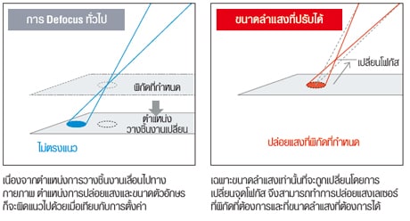 เมื่อทำการมาร์กแบบละเอียดโดยไม่ทำให้เกิดความเสียหายกับพื้นผิวของชิ้นงาน การจงใจทำให้เลเซอร์ออกนอกโฟกัสเป็นเทคนิคหนึ่งที่ใช้ได้ดีมากกับพลาสติก เรซิน และโลหะ สำหรับระบบเลเซอร์ทั่วไป เมื่อชิ้นงานวางอยู่นอกโฟกัสโดยไม่มีการปรับแต่งภายในเลเซอร์ จะทำให้เกิดการวางตำแหน่งตัวอักษรผิดพลาดและเกิดความผิดเพี้ยนในการมาร์ก ระบบ 3-Axis สามารถทำการปรับเงื่อนไขต่างๆ จากภายในได้อย่างง่ายดายด้วยการตั้งค่าซอฟต์แวร์อย่างง่ายๆ ดังนั้นจึงไม่จำเป็นที่จะต้องทำการปรับเปลี่ยนการจัดวางชิ้นงาน เพียงทำการปรับชดเชยแนวแกน X/Y/Z อยู่ภายในก็สามารถขจัดความผิดพลาดและความผิดเพี้ยนของการมาร์กได้