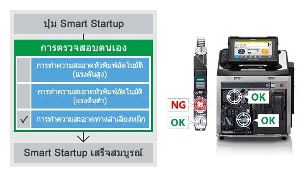 กดปุ่ม Smart Startup เพื่อเปิดเครื่อง MK-G ซีรีส์ เครื่องพิมพ์จะรับสถานะอุปกรณ์โดยอัตโนมัติและเลือกวิธี การทำความสะอาดโดยจะดำเนินการเมื่อจำเป็นเท่านั้น และ จะใช้ตัวทำละลายน้อยที่สุด จึงช่วยลดต้นทุนได้อย่างมาก