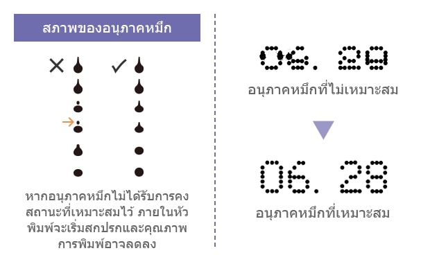 ฟังก์ชันล้างทำความสะอาดหัวพิมพ์ได้เองโดยอัตโนมัติ ของ MK-G ซีรีส์ จะทำความสะอาดตั้งแต่ทางลำเลียงหมึก ไปจนถึงส่วนประกอบที่จำเป็นทั้งหมดเพื่อรักษาคุณภาพ ของการพิมพ์ อีกทั้งการดูดระหว่างทำความสะอาด ยังช่วยลดกลิ่นไม่พึงประสงค์ได้ จากนั้นเมื่อการทำความ สะอาดเสร็จสมบูรณ์แล้ว พัดลมในตัวจะเป่าหัวพิมพ์ให้แห้ง โดยอัตโนมัติ