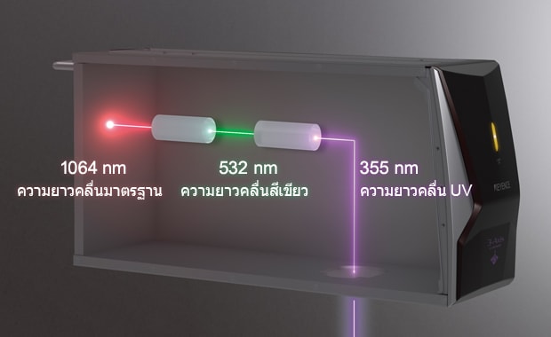 ความยาวคลื่น 355 nm จะให้การมาร์กที่มีความเปรียบต่างสูงและลด ความเสียหายที่เกิดขึ้นกับชิ้นงานให้เหลือน้อยที่สุด