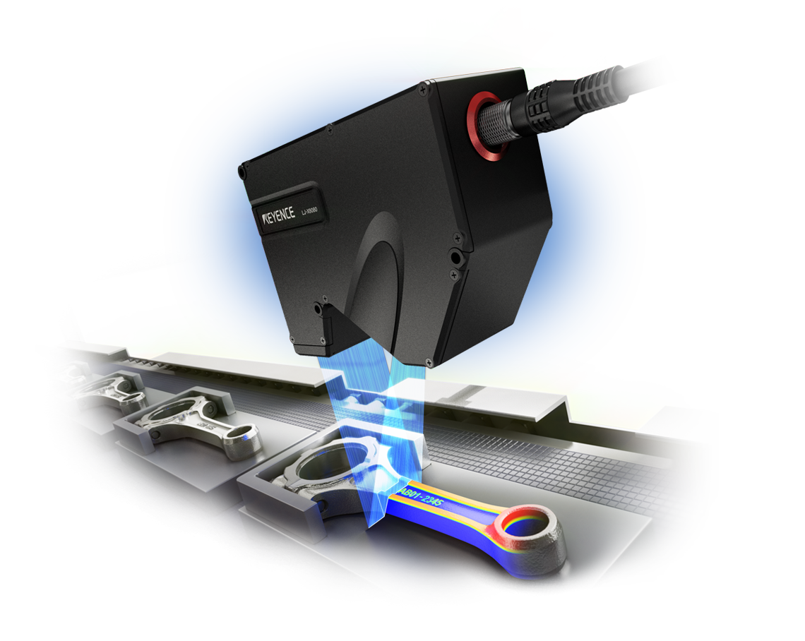 สามารถวัดโปรไฟล์เเละรูปร่างของเป้าหมายโดยใช้เครื่องวัดโปรไฟล์เลเซอร์ 2D ความเร็วสูง LJ-V7000 ซีรีส์ ใช้หลักการเก็บข้อมูลความสูงตลอดเเนวเลเซอร์ ด้วยวิธีการดังกล่าว ทำให้การตรวจสอบ 100% เป็นไปได้สำหรับเป้าหมายที่มีระบบอื่นๆ ที่มักพบปัญหาจากความไม่ชัดหรือเเสงจ้า เลเซอร์สีฟ้าของเซนเซอร์เเละ CMOS ที่ถูกปรับเเต่งมาโดยเฉพาะ ช่วยให้เซนเซอร์มีช่วงไดนามิกกว้าง สามารถวัดเป้าหมายที่มีหลากหลายประเภทหรือสีพื้นผิว ตั้งเเต่กระจกเละเหล็กไปจนถึงยางสีดำ การสุ่มตัวอย่างความเร็วสูง (สูงสุด 64 kHz) สามารถตรวจวัดชิ้นงานขณะที่มีการเคลื่อนที่ได้ ซึ่งช่วยเพิ่มประสิทธิภาพในการผลิต นอกจากนั้นเซนเซอร์ LJ-V7000 ซีรีส์ สามารถเชื่อมต่อกับชุดควบคุมของ LJ-X8000 ซีรีส์ เพื่อทำการวัดเเละตรวจสอบเเบบ 3D