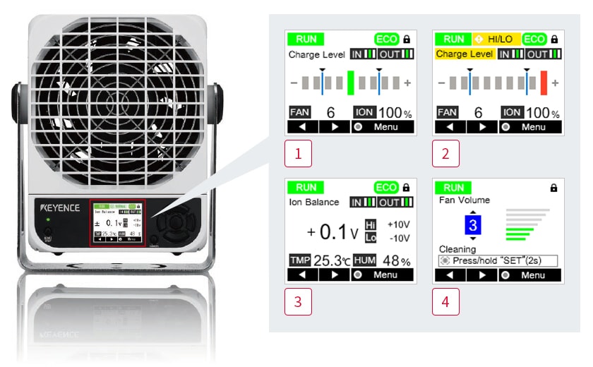 บนยูนิตหลักมีหน้าจอ LCD ที่สามารถใช้ตรวจสอบสถานะการทำงาน ข้อมูลไฟฟ้าสถิต และข้อมูลอื่นๆ