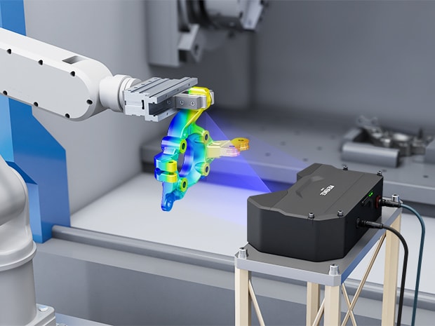 เมื่อขึ้นรูปเสร็จแล้ว หุ่นยนต์ก็สามารถขนชิ้นงานออก และตรวจสอบแบบ 3D ได้ เพียงแค่ถือชิ้นงานไว้หน้า LJ-S8000 ซีรีส์