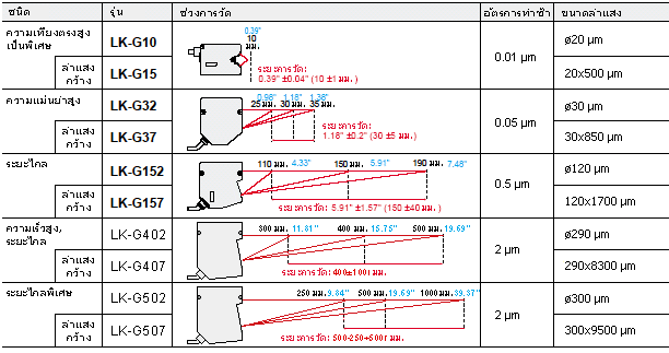 เซนเซอร์วัดระยะด้วยเลเซอร์เเบบไตรแองกูเลชั่น LK-G5000 ซีรีส์ โดดเด่นเรื่องความเร็วเเละความเเม่นยำสูงสำหรับเเอปพลิเคชันวัดระยะเเบบไม่สัมผัส โดยเซนเซอร์รุ่นนี้มีฮารด์เเวร์ที่ทันสมัย เช่น RS-CMOS เเละชุดเลนส์ HDE ส่งผลให้ผลลัพธ์บนวัสดุต่างๆมีความน่าเชื่อถือจากการสะท้อนแสงกลับที่จุดโฟกัสตลอดเวลา ด้วยเทคโนโลยีดังกล่าว ทำให้เซนเซอร์มีความเป็นเชิงเส้นเหนือชั้นกว่า (0.02% ของ F.S.) เเละอัตราการทำซ้ำ (0.005 um) ด้วย ความเร็วในการสุ่มตัวอย่างสูงสุดที่ 392 kHz ส่งผลให้ LK-G5000 ซีรีส์ สามารถตรวจจับการสั่นสะเทือน การเปลี่ยนแปลงเล็กน้อยของเป้าหมายที่เคลื่อนที่เร็วได้อย่างน่าเชื่อถือ เซนเซอร์เเต่ละขนาดถูกออกแบบมาเพื่อใช้งานได้ทุกอุตสาหกรรมเเละเเอปพลิเคชั่นที่หลากหลาย ทำให้ผู้ใช้สามารถเลือกหัวเซนเซอร์ที่เหมาะสมตามความต้องการในแต่ละช่วงการวัด ความเเม่นยำ เเละขนาดของจุดลำเเสงได้