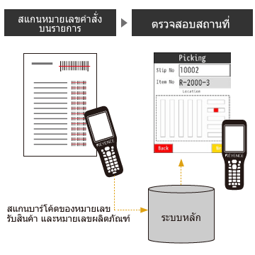 วิเคราะห์ว่าผ่าน/ไม่ผ่านได้ทันทีด้วยการสแกนบาร์โค้ดของผลิตภัณฑ์ระหว่างการหยิบสินค้าและตรวจสอบข้อมูลนี้เทียบกับรายการการคัดเลือก โดยทั่วไปแล้วจำเป็นจะต้องตรวจสอบครั้งสุดท้ายด้วยการอ่านบาร์โค้ดก่อนการจัดส่ง แต่การติดตั้ง Handheld Mobile Computer จะช่วยให้ตรวจสอบไปพร้อมกับการหยิบสินค้าได้