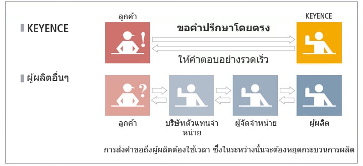 แม้จะเป็นอุปกรณ์ที่ใช้งานง่ายและสะดวกสบายก็ยังต้องการบริการสนับสนุนเพื่อความสบายใจของลูกค้าในการเลือกใช้ผลิตภัณฑ์ KEYENCE จำหน่ายผลิตภัณฑ์แก่ลูกค้าโดยตรง จึงสามารถตอบสนองได้อย่างรวดเร็วและตรงจุดเมื่อลูกค้าต้องการความช่วยเหลือ โทรสายด่วนขอความช่วยเหลือเพื่อติดต่อกับวิศวกรของเรา ผู้ซึ่งจะช่วยเหลือคุณในทุกปัญหาที่อาจเผชิญอยู่ วิศวกรเครื่องกลที่มีความเชี่ยวชาญของเราจะให้การสนับสนุนจากผู้ผลิตโดยตรง นอกจากนี้ KEYENCE ยังสามารถจัดส่งวัสดุสิ้นเปลืองทุกชนิด เช่น หมึก รวมถึงเครื่องพิมพ์อิงค์เจ็ทให้คุณได้ภายในวันเดียวกับที่คุณสั่ง สามารถติดต่อเราได้ในกรณีที่สต็อกของคุณหมดหรือมีการเพิ่มกำลังการผลิตเฉียบพลัน