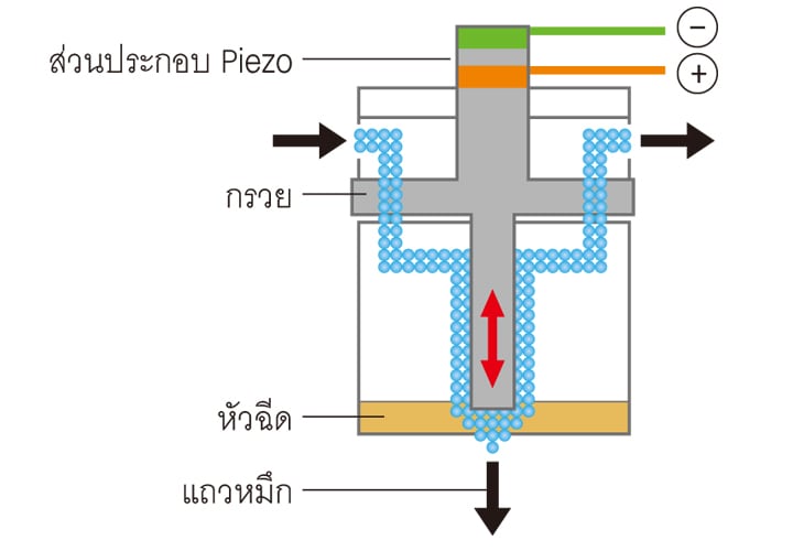 Piezo โดยเมื่ออนุภาคหมึกที่มีประจุไฟฟ้าไหลผ่านเซนเซอร์ก็จะตรวจจับเพื่อปรับประจุไฟฟ้าที่ใช้ให้เหมาะสม