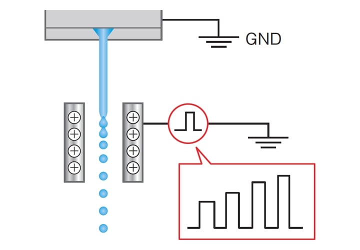 จะแตกต่างกันไปตามขนาดของพัลส์ ทันทีที่ละอองหมึกก่อตัวขึ้นปริมาณของประจุไฟฟ้าที่แต่ละละอองหมึกได้รับก็จะ