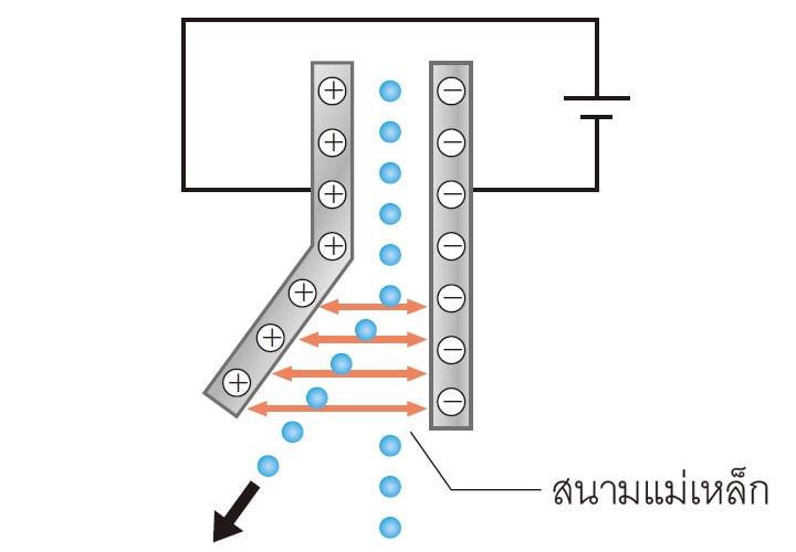 แผ่นอิเล็กโทรดหักเห ละอองหมึกจะเปลี่ยนทิศทางตามประจุที่ได้รับ