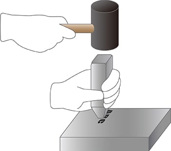 ผู้ที่ทำการมาร์กจะถือตราประทับไว้ในมือและใช้ค้อนตอกจากด้านบน ตัวอักษรที่สร้างขึ้นจะมีความลึกและชัดเจน การมาร์กชนิดนี้จึงใช้สำหรับสร้างตัวอักษรที่ทนทานต่อการเสื่อมสภาพที่เกิดจากรอยขีดข่วนที่ลึกและแรงเสียดทานได้ เหมาะสำหรับมาร์กชิ้นส่วนที่ผลิตจากวัสดุ เช่น อะลูมิเนียม เหล็กและทองเหลือง อีกทั้งยังเหมาะกับการมาร์กสิ่งของที่มีน้ำหนักมากและเคลื่อนย้ายได้ยาก