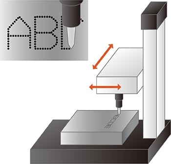เครื่องนี้จะใช้แรงดันลมหรือไฟฟ้าส่งไปที่หมุด ซึ่งเรียกกันว่าหมุดการมาร์กที่จะมาร์กจุดเป็นกลุ่มๆ เพื่อมาร์กพื้นผิวของชิ้นงาน วิธีการนี้ยังมีชื่อเรียกอีกอย่างหนึ่งว่าการมาร์กแบบ Micro-Impact ใช้งานได้ดีเยี่ยมในการมาร์กวัสดุเนื้อแข็ง เช่น พื้นผิวโลหะที่ไม่สม่ำเสมอและเรซินผสม ทำการมาร์กได้โดยไม่ต้องคำนึงถึงสภาพพื้นผิว (เปียก ฝุ่น ฯลฯ ) ของชิ้นงาน