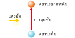 อะตอม (โมเลกุล) ดูดซับพลังงานจากภายนอก จะเลื่อนจากระดับต่ำ (สถานะพลังงานต่ำ) ไปสู่ระดับสูง (สถานะพลังงานสูง) สถานะนี้อธิบายได้ว่าเป็นสถานะถูกกระตุ้น