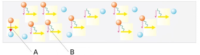 ตามที่ได้แสดงในภาพตัวอย่างด้านล่าง เมื่อแสงถูกส่งผ่านอิเล็กตรอนที่มีพลังงานในระดับเดียวกัน จะมีการสร้างโฟตอนของแสงที่มีพลังงาน เฟส และทิศทางที่เทียบเท่า ขึ้นเพิ่มเติม ในการปล่อยพลังงานที่ถูกกระตุ้น โฟตอนของแสงที่ถูกส่งผ่านจะปล่อยโฟตอนสองตัวเสมอ สิ่งนี้เรียกว่า การปล่อยพลังงานที่ถูกกระตุ้น