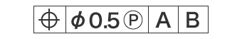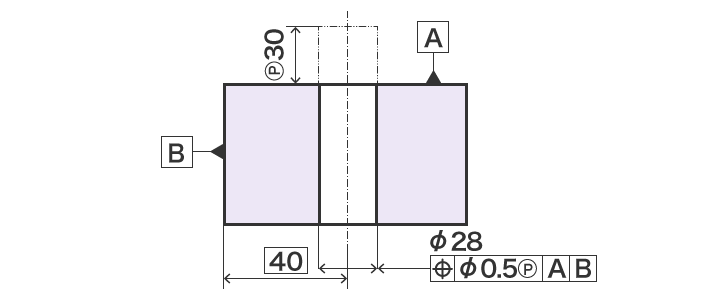 ต่อไปนี้คือตัวอย่างของการระบุที่ระบุว่า “เส้นผ่านศูนย์กลาง ของเพลา 28 มม. ในพื้นที่เสมือนจะต้องไม่เกินเส้นผ่านศูนย์กลาง ทรงกระบอกขนาด 0.5 มม. ตลอดช่วงความยาวของส่วนที่ยื่นออกมาขนาด 30 มม. ของเส้นผ่านศูนย์กลาง ทรงกระบอกขนาด 28 มม. ที่มีแกนอยู่ห่างจาก Datum B 40 มม. และตั้งฉากกับ Datum A” ระบุส่วนที่ยื่นออกมาด้วยเส้นที่ประด้วยจุดสองจุด
