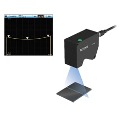 หลังจากทำการสแกนชิ้นงานโดยใช้เครื่องมือวัดด้วยแสงชนิด Reflective ความโก่งงอจะสามารถวัดได้โดยใช้ข้อมูลความสูงจากจุดใดก็ได้สามจุด LK-G ซีรีส์ให้การสุ่มตัวอย่างด้วยความเร็วสูงพิเศษ ซึ่งทำให้การวัดรวมถึงการสแกนมีความเสถียร