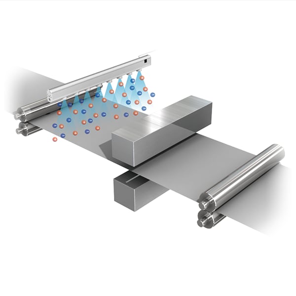 ในการเคลือบกระดาษด้วยชั้นซิลิโคน ประจุไฟฟ้าสถิตกำลังสูงมาก (50 ถึง 100kV) จะเกิดขึ้นในกระดาษติดแถบสติ๊กเกอร์ ซึ่งอาจนำไปสู่ปัญหาต่างๆ เช่น การเกาะติดของอนุภาคแปลกปลอม ประกายไฟ และความไม่สะดวกสบายของเจ้าหน้าที่ เครื่องกำจัดไฟฟ้าสถิตสามารถขจัดปัญหาเหล่านี้ได้