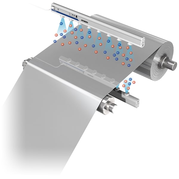 ในการเคลือบกระดาษด้วยชั้นซิลิโคน ประจุไฟฟ้าสถิตจำนวนมาก (50 ถึง 100 kV) จะเกิดขึ้นในกระดาษติดแถบสติ๊กเกอร์ และนำไปสู่ปัญหาต่างๆ เช่น การเกาะติดของสิ่งแปลกปลอม ประกายไฟ และเจ้าหน้าที่ทำงานลำบาก เครื่องกำจัดไฟฟ้าสถิตสามารถขจัดปัญหาเหล่านี้ได้