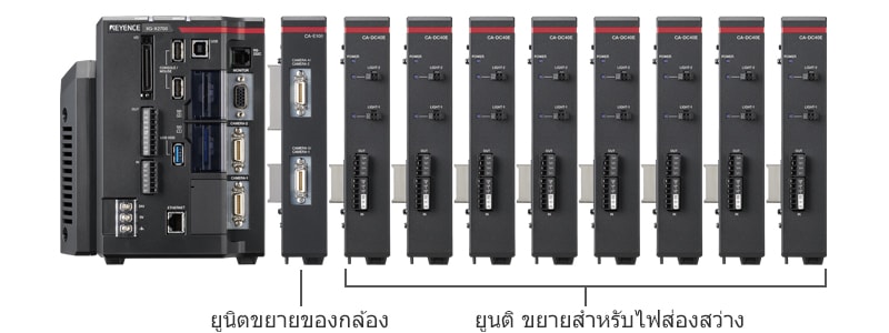 คอนโทรลเลอร์ไฟ LED สามารถต่อโดยตรงกับวิชันซิสเต็ม ที่ใช้ร่วมกันได้ โดยลดการเดินสายไฟไฟให้น้อยที่สุด คอนโทรลเลอร์ จะช่วยในการควบคุมไฟส่องสว่างโดยตรงและการสโตรบของ แสงด้วยทริกเกอร์อินพุตการจับภาพโดยไม่ต้องใช้ PLC สามารถ เชื่อมต่อยูนิตขยายสำหรับไฟส่องสว่างได้สูงสุด 8 ยูนิต* กับหนึ่งวิชันซิสเต็ม ทำให้สามารถควบคุมไฟได้ถึง 16 ดวง โดยไม่ต้องเดินสาย
