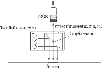 ไฟชนิดโคแอกเซียลจะส่งผ่านแสงจากด้านข้างลงบนวัตถุ กึ่งกระจก กระจกจะสะท้อนแสงลงบนชิ้นงาน แสงที่สะท้อนแบบสมบูรณ์จะผ่านกลับขึ้นไปยังกล้อง ในขณะที่ แสงสะท้อนแบบกระจายจากชิ้นงานจะสะท้อนออกไป ซึ่งทำให้ เกิดความเปรียบต่างที่จุดขอบของชิ้นงาน นอกจากนี้ ยิ่งไฟอยู่ไกลจากชิ้นงานมากเท่าไร แสงที่สะท้อน ก็จะสะท้อนออกไปมากเท่านั้น ซึ่งทำให้เกิดความเปรียบต่าง และความละเอียดของภาพมากขึ้น