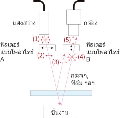แสง (1) จะถูกโพลาไรซ์ด้วยฟิลเตอร์แบบโพลาไรซ์ A ดังนั้นเฉพาะแสงในแนวนอน (2) เท่านั้น จะถูกส่งผ่านไปยังชิ้นงาน เนื่องจากฟิลเตอร์แบบโพลาไรซ์ B ถูกตั้งค่าให้ยอมรับเฉพาะแสง ในแนวตั้งเท่านั้น แสงสะท้อนอย่างสมบูรณ์ (3) ที่สะท้อนจากพื้นผิวฟิล์มจะถูกตัดออก อย่างไรก็ตามแสงที่สะท้อนแบบกระจาย (4) จากชิ้นงานจะมีองค์ประกอบของแสงในแนวตั้ง (5) ซึ่งสามารถผ่านฟิลเตอร์ B ไปยังกล้องได้